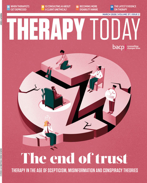 Front cover illustration for the March 2026 Issue of Therapy Today Magazine. The aim of the illustration was to depict the theme of therapy in the age of scepticism, misinformation and conspiracy theories.